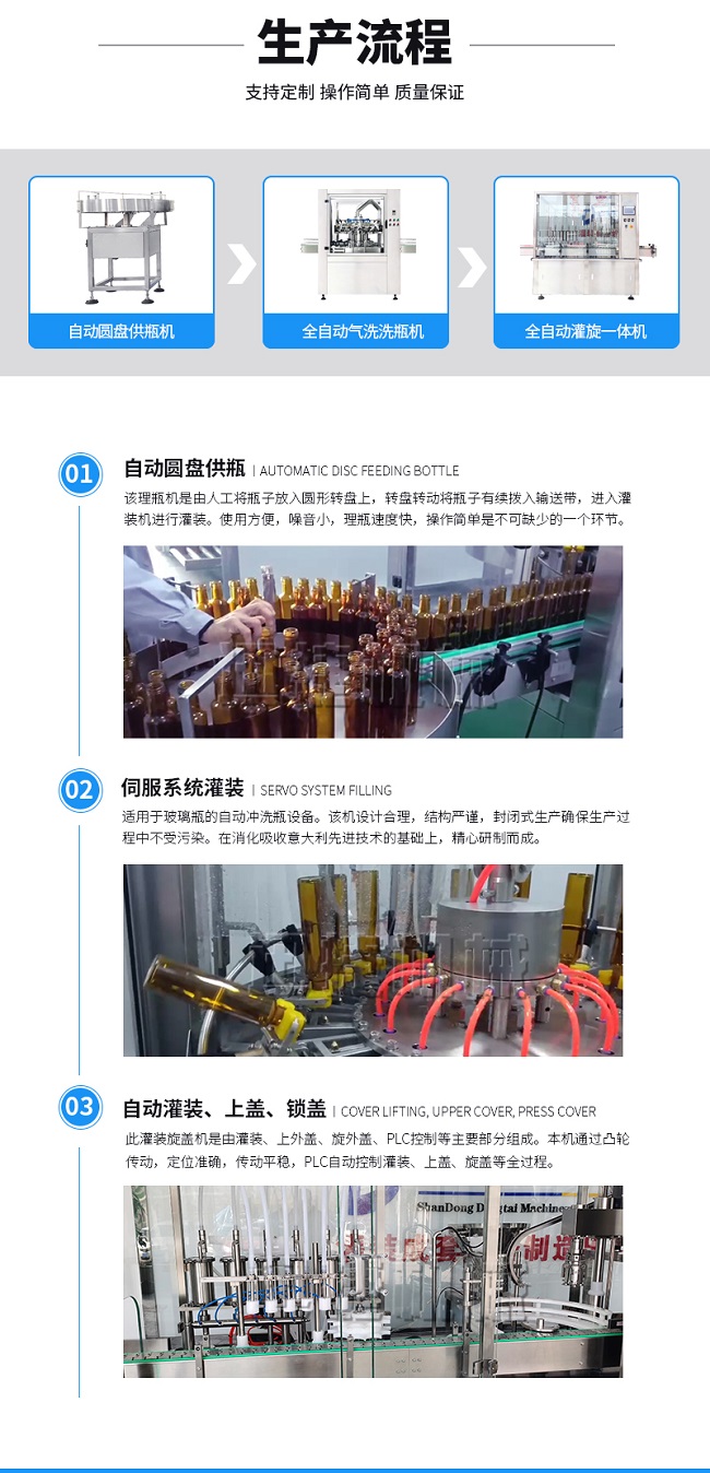 本灌裝流水線設(shè)備具有穩(wěn)定可靠、自動(dòng)化水平高,相比同類產(chǎn)品有著更長的使用年限,維護(hù)簡單,整線中各設(shè)備的協(xié)調(diào)性、連貫性強(qiáng),整線設(shè)計(jì)合理等特點(diǎn)。灌裝設(shè)備采用系統(tǒng)結(jié)構(gòu),為當(dāng)今行業(yè)內(nèi)水平,整線滿足量產(chǎn)化、集成化生產(chǎn)的需要。